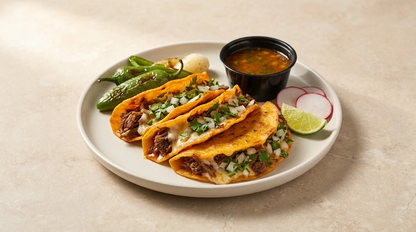 Three cheesy, pan-fried birria tacos served with a rich dipping consomé, Mexican rice, refried beans, and classic fresh garnishes.